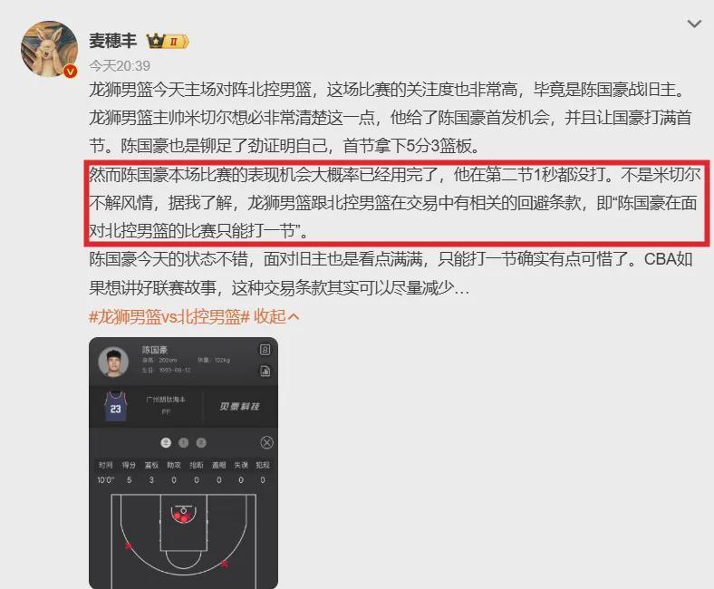 去年休赛期,陈国豪在三方交易中被送至广州队,然而因为“回避条款”,这哥们对阵北控队的比赛只能打一节......